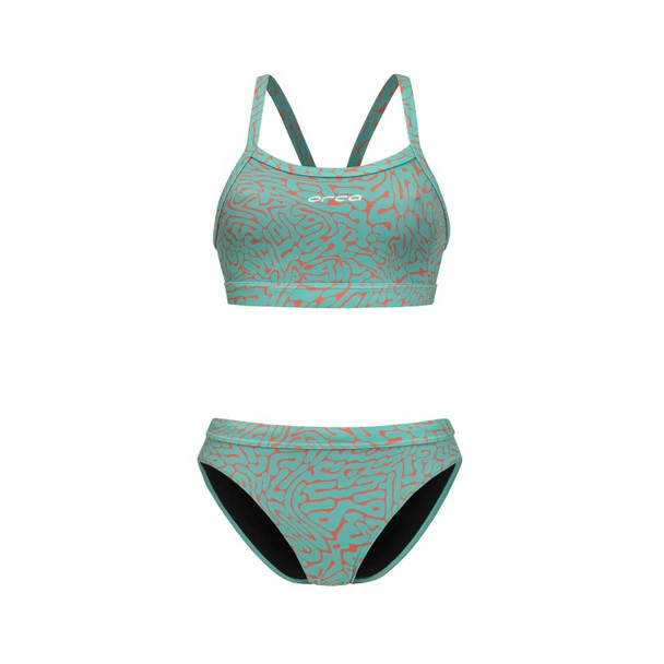 This two-piece swimsuit with wide straps is made with a compressive fabric for added support and comfort while swimming in the pool or in open water.